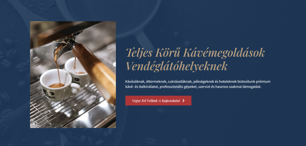 Ezt követően a marketingfelületekre fókuszáltunk. Mivel a partnerünk már rendelkezett egy működő weboldallal (caffetrade.hu), nem volt szükség teljes arculatváltásra. Az új, kifejezetten konverzióra optimalizált landing oldalt a meglévő designhoz illeszkedve építettük fel, így az tökéletesen belesimult a már ismert márkaélménybe, mégis hatékonyabban terelte az érdeklődőket.